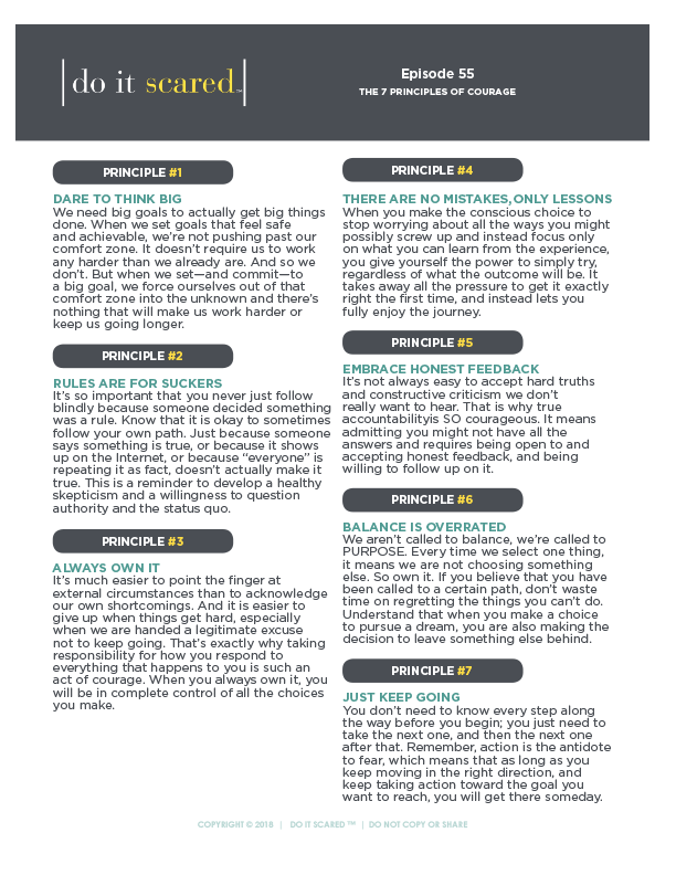 The seven principles of courage are the basic principles we all need to adopt to start facing our fears head-on. I’ve actually already talked about each of these seven principles on the podcast before, but today I’m bringing them all together and talk about how adopting this new set of core beliefs can help give you the courage to do hard things, achieve your goals and dreams, and finally create that life you love!